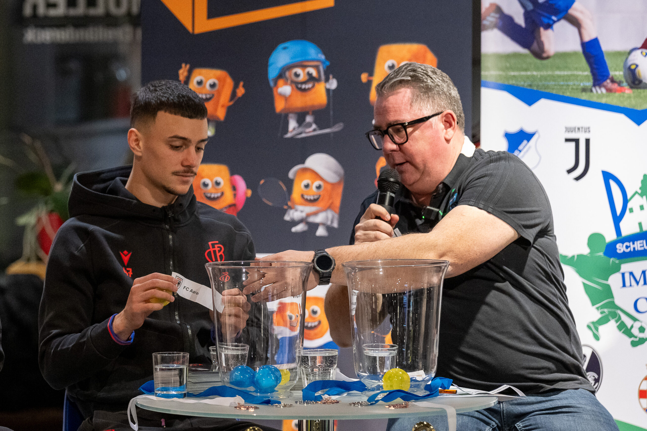 Die spannende Frage in jedem Jahr ist die der Losfeen für die verschiedenen Auslosungen des PS-Immo-Cup. In diesem Jahr durfte Floyd Kleinhans mit Tim Plattner (ehem. FVLB-Talent und aktuelle SC Freiburg U17) sowie mit Tim Pfeiffer und Dion Kacuri vom FC Basel gleich drei Losfeen begrüßen. Kurzweilig berichteten die drei Spieler über ihren Alltag im Fußballgeschäft und ihre Erlebnisse am PS-Immo-Cup als Teilnehmer.