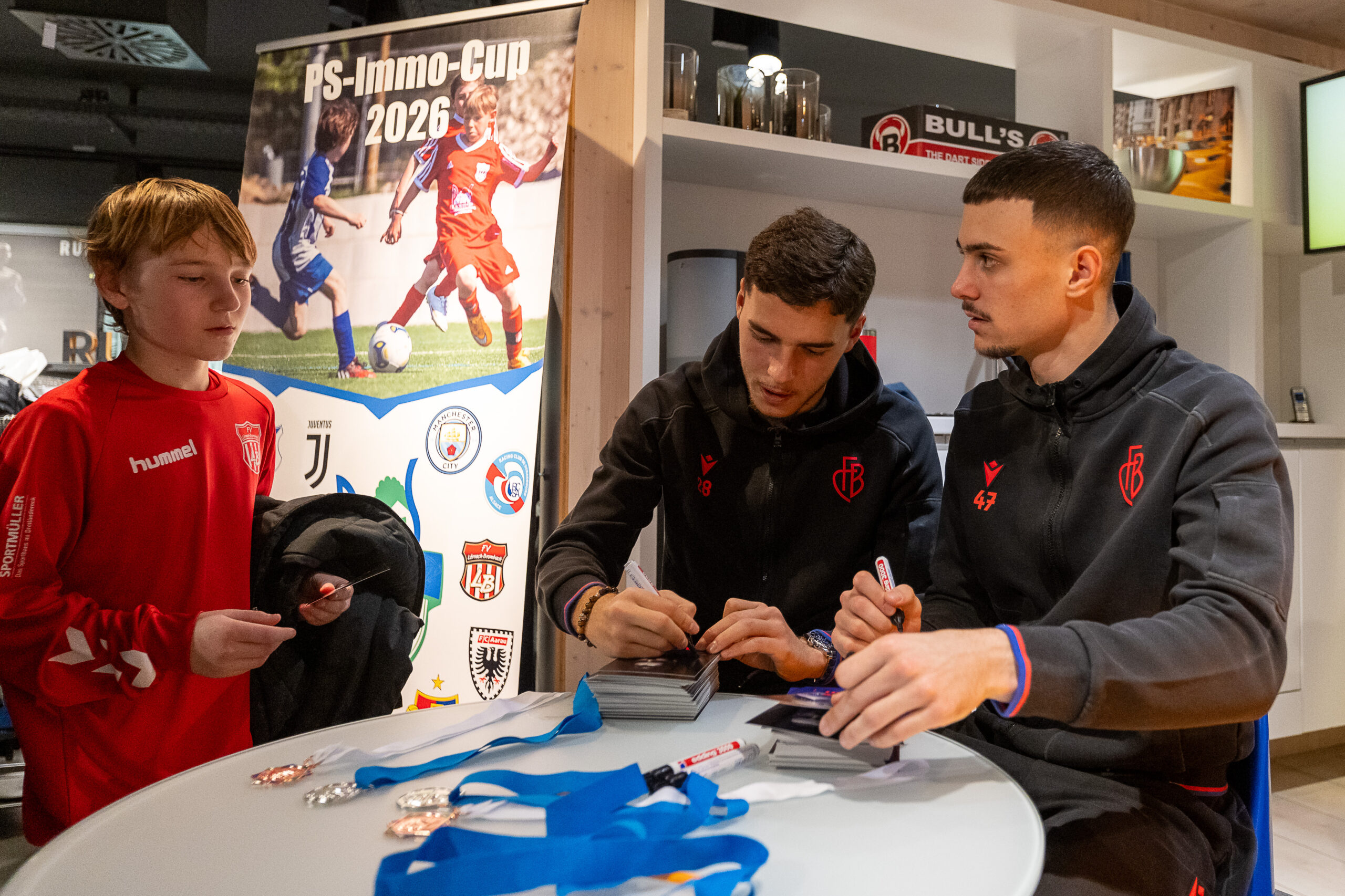Welches Kind träumt nicht von Spielen gegen Manchester City, Juventus Turin oder Bayern München? Jahr für Jahr wird dieser Traum für die FVLB-Talente dank dem PS-Immo-Cup und der Unterstützung von Familie Scheuermann möglich. Ein erstes Highlight bildet immer die Gruppenauslosung im Sportmüller Lörrach. Die Auslosung brachte hochkarätige Gegner für die FVLB-Talente der U13-, U14- und U15-schwarz sowie U15-rot.