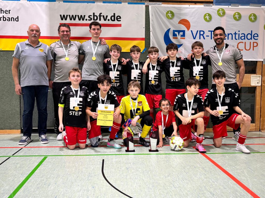 In der Hallenbezirksmeisterschaft Hochrhein konnte die U13-schwarz in der Vorrunde, Zwischenrunde, dem Halbfinale und der Endrunde überzeugen und wurde verdient Hallenbezirksmeister am 22.02.2026 in Waldshut. Am Samstag machte man sich auf den Weg nach Pfullendorf. Nach einer Stärkung im Vereinsheim des SC Pfullendorf und der moralischen Unterstützung der U17 beim 1:0 Sieg in Pfullendorf, startete das Team gut in das Turnier. Die ersten vier Spiele gegen den FV Bad Rotenfels (3:1), FC 08 Radolfzell (2:1), FC Fischerbach (2:0) und den FC 08 Villingen (2:0) konnten überzeugend gewonnen werden. Durch die Punkteteilungen der anderen Teams, war den FVLB-Talenten bereits vor dem abschließenden Spiel gegen den Bundesliganachwuchs des SC Freiburg (0:5) der Titel nicht mehr zu nehmen. Erstmals konnten die FVLB-Talente den Titel des südbadischen Futsalmeisters gewinnen und vertreten gemeinsam mit dem SC Freiburg den Verband beim Landesfinale am 14.03.2026 in Straubenhardt (Baden). Hier trifft der FVLB auf zwei Vertreter aus Baden sowie vier Vertreter aus Württemberg (wir berichten noch).